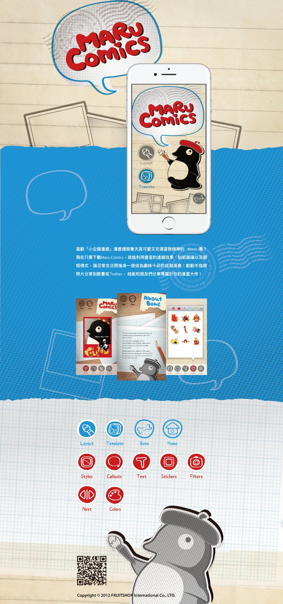 『 Maru Comics 』App『 Maru Comics 』是一款漫畫風格的拍照app ,主視覺風格設計,內建的漫畫貼圖與照片邊框發想等。