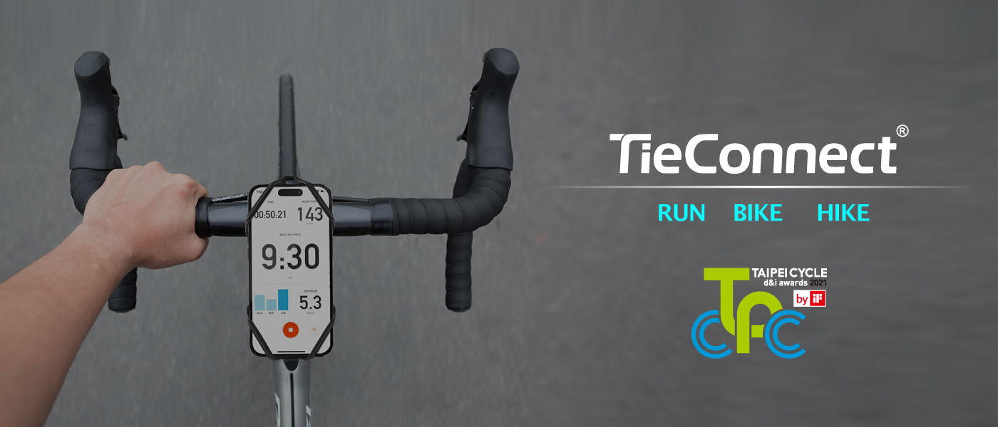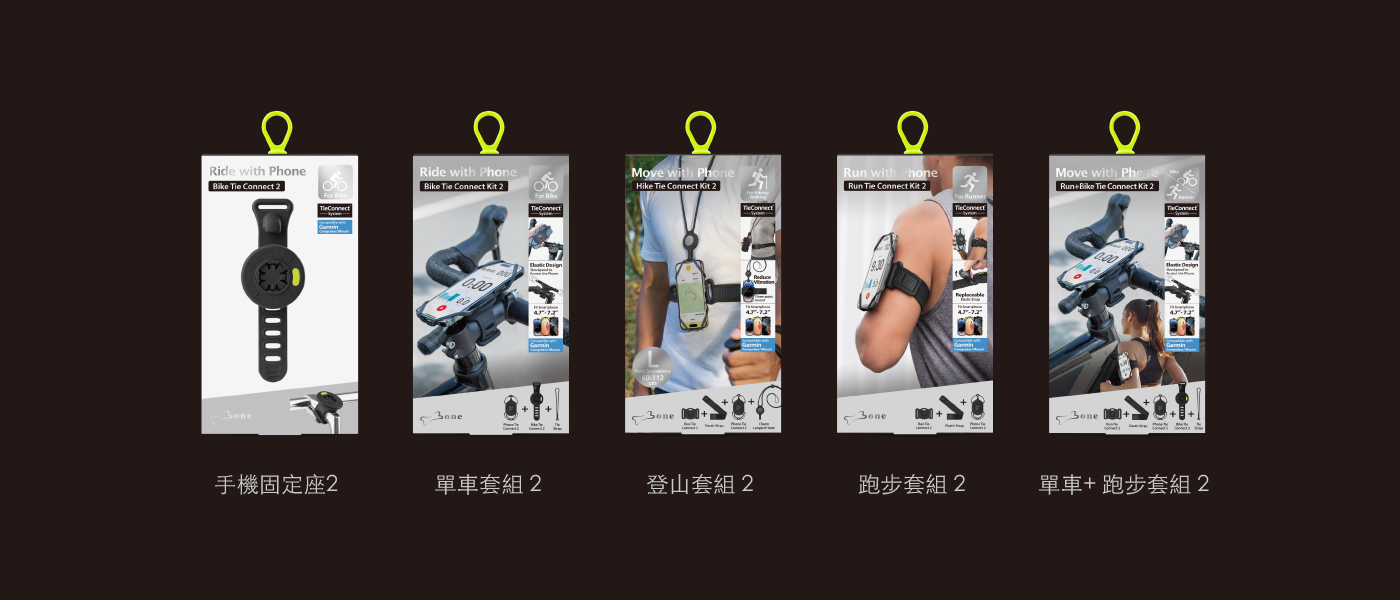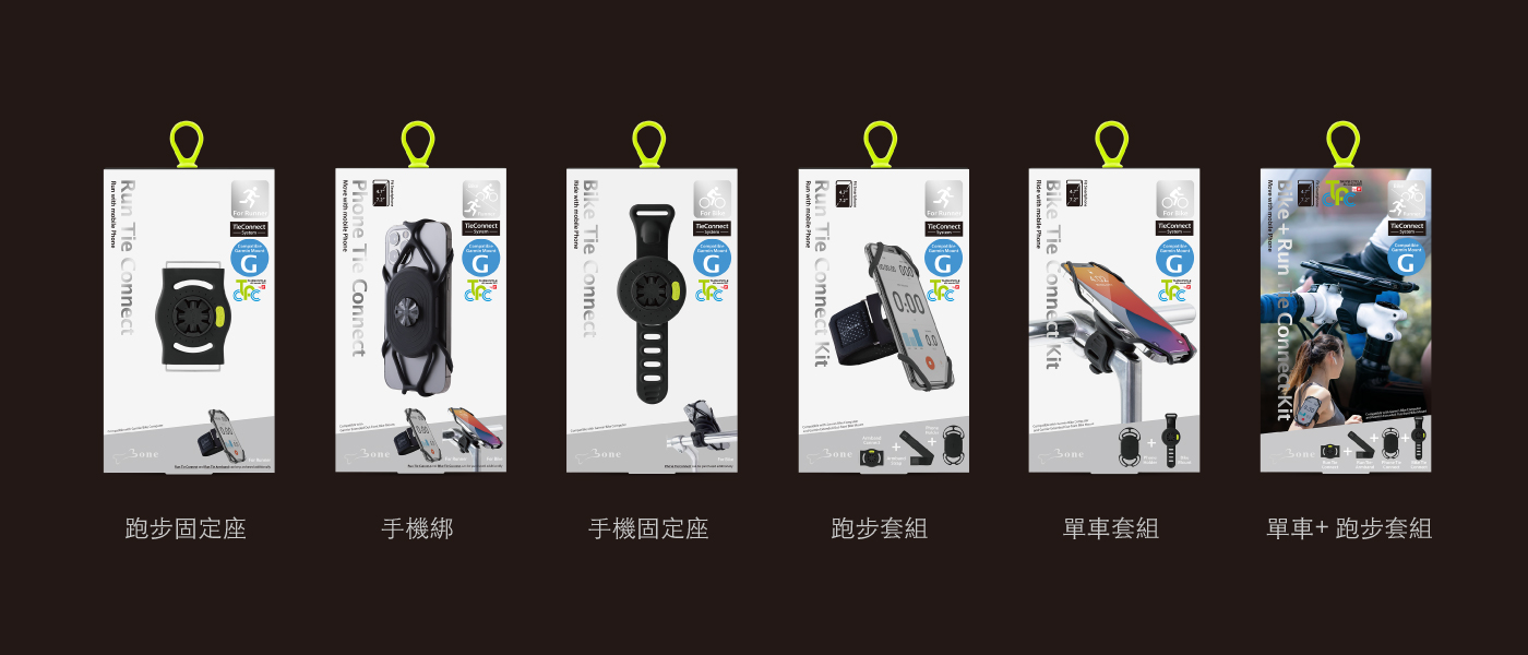 『 Tie Connect 綁接系統 』一代在2021 問市,手機可切換跑步、騎車模式,分別有兩款各自通用Garmin 與Bryton 的車錶系統,主要負責此產品線的標準字設計,Amazon 平台Langing Page 素材與全系列包裝。
