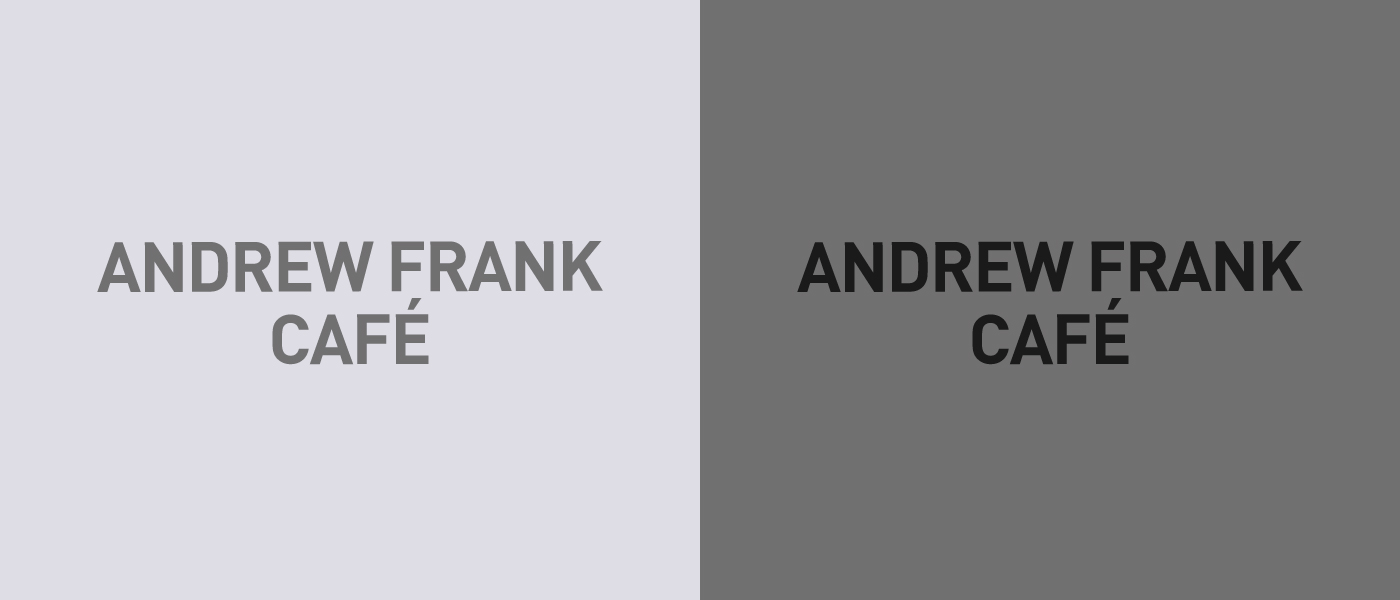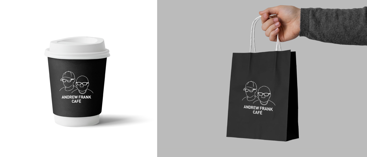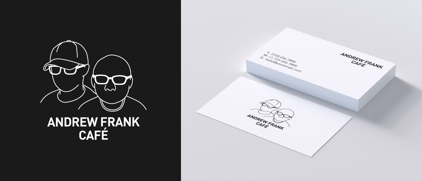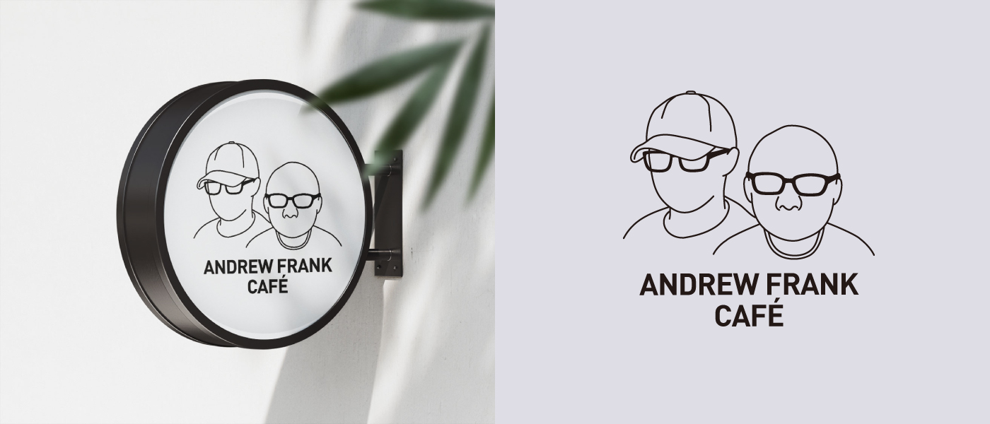 以2位大叔的人物意象作為整家店的主軸,Logo 的簡單線條設計出「Andrew Frank Cafe」的Logo,呼應年輕時簡單的夢想,卻不簡單的達成完成實現了,2位大叔的老實人性格默默的付出努力,極簡的的灰黑色調也是襯托出大叔們的低調行事作風。