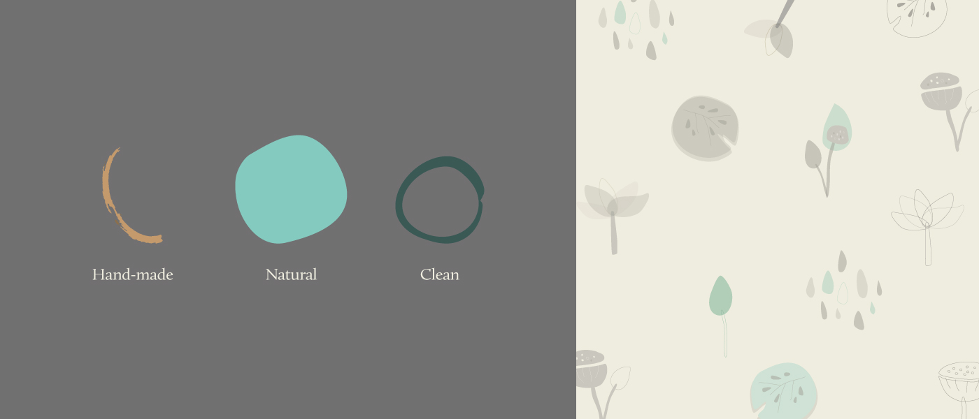 與業主討論最能代表「水荷」的主要中心,以「手工」、「天然」、「純淨」為主軸,做為品牌視覺規劃的重點,親手繪製適合純天然風格的插畫,貫穿品牌純天然手工製作形象,樸實溫潤的色彩搭配,呈現「水荷」用心提供純天然產品給消費者以及友善環境的形象。